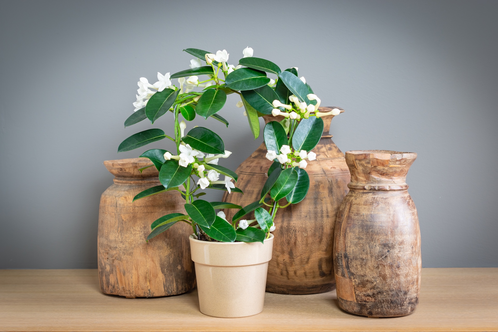 Стефанотис, или мадагаскарский жасмин, — вечнозелёная лиана с плотными кожистыми овальными листьями насыщенно-зелёного цвета. Побеги гибкие, благодаря чему их можно пустить по дуге или другой опоре, формируя аккуратные композиции. Цветки белые, звёздчатые, с вытянутыми лепестками и выраженным сладким ароматом.