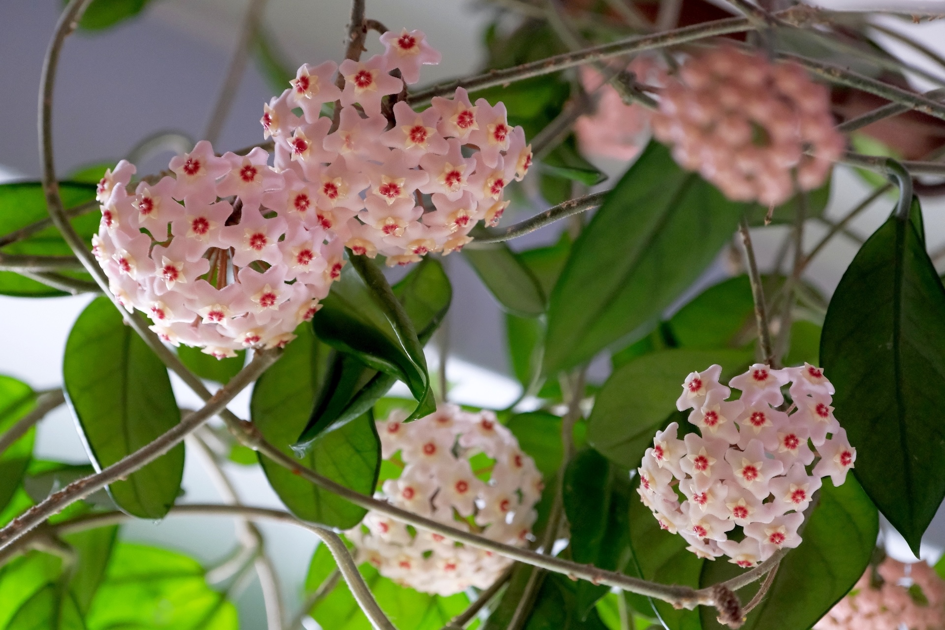 Хойя, или восковой плющ, — вечнозелёная лиана с плотными, иногда мясистыми листьями овальной или вытянутой формы. Во время цветения особенно красива благодаря шаровидным соцветиями из плотных розовых цветков с яркой серединой.