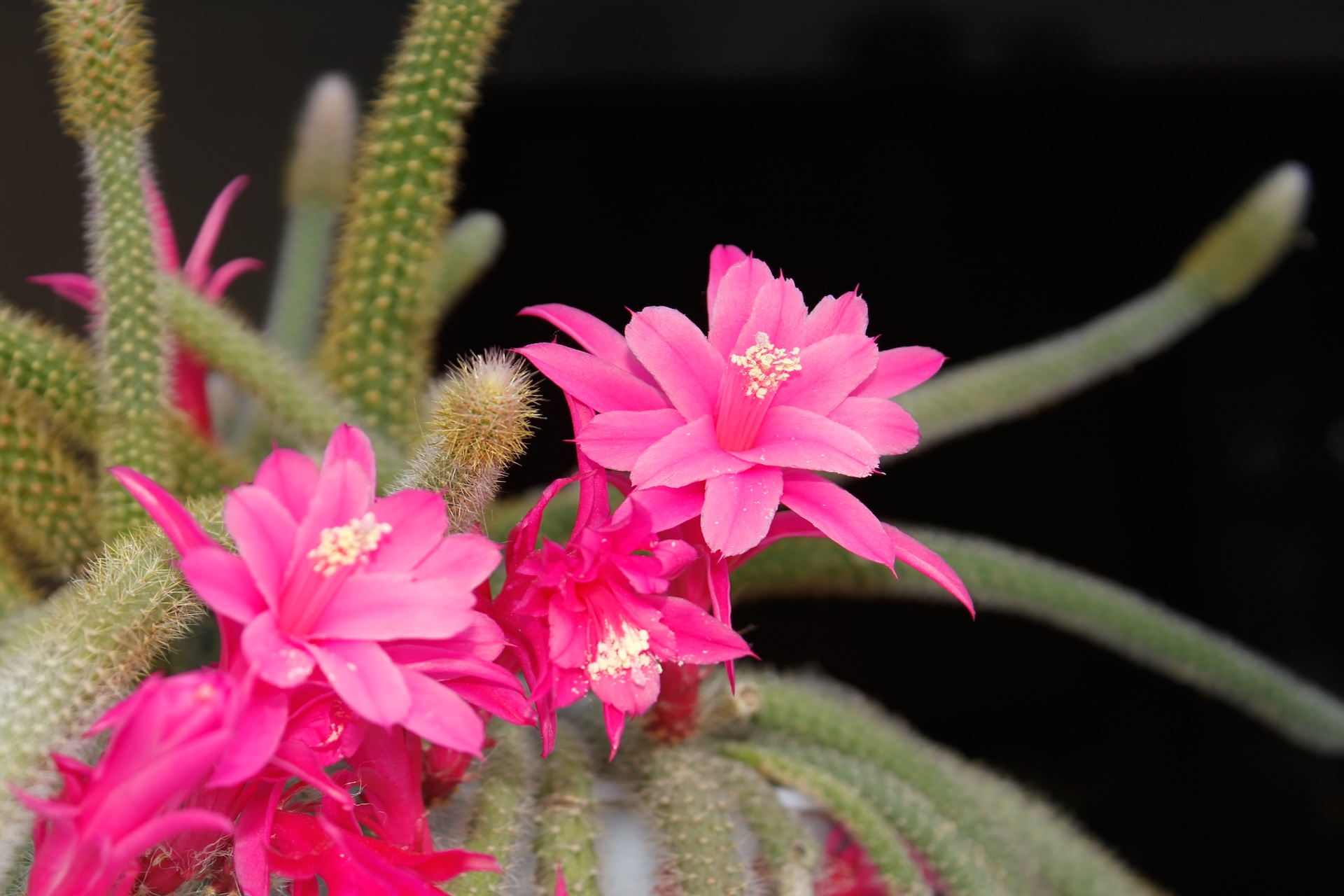 Это ампельный кактус с длинными тонкими свисающими побегами цилиндрической формы. Его покрытые мелкими колючками стебли могут достигать значительной длины, иногда больше метра. Цветки крупные, яркие, чаще всего розовые или малиновые. По форме напоминают воронку.