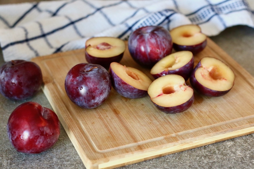 2. Сливы помойте, обсушите, разрежьте пополам и удалите косточки.