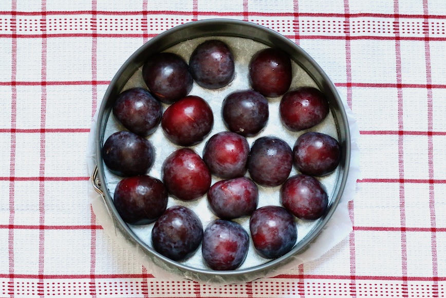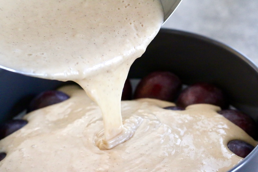 8. Залейте сливы тестом и равномерно распределите его по форме.