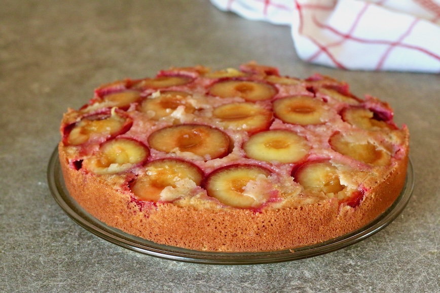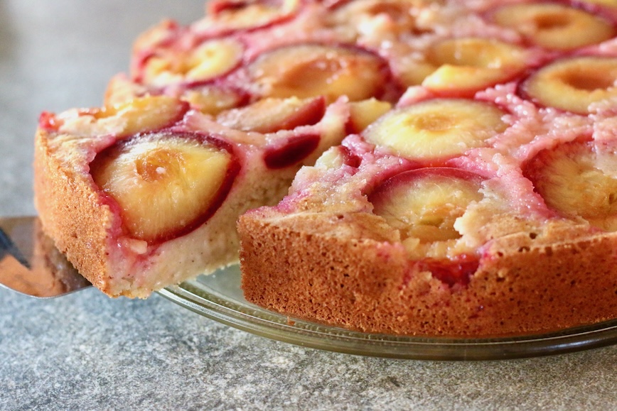 Мне понравилось использовать для приготовления этого пирога крупные сливы. Если положить их в форму срезом вниз, они дают сок. Он карамелизуется в процессе выпечки. Благодаря этому десерт симпатично выглядит на блюде и получается ещё вкуснее.