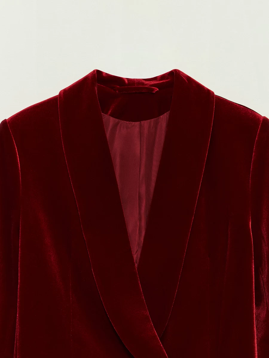 Алый однобортный жакет из красного бархата с полуприлегающим кроем. Добавляет изысканности образу. Можно сочетать с брюками и юбками.