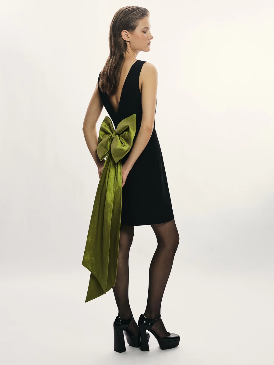 Платье-футляр с контрастным бантом на спине. Подчёркивает фигуру. Создаёт праздничный образ за счёт акцентной детали.