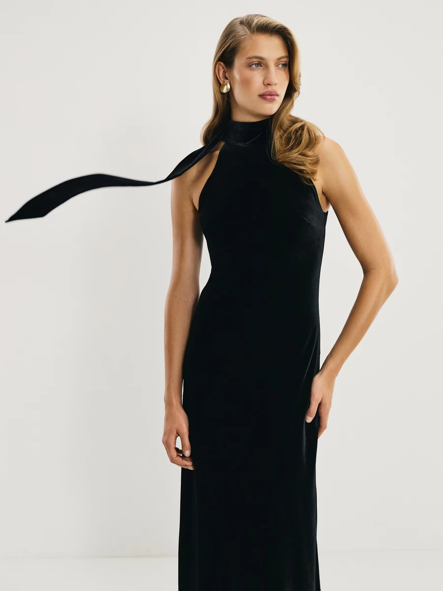 Длинное бархатное платье А‑силуэта. Подчёркивает фигуру. Идеально смотрится с каблуками.