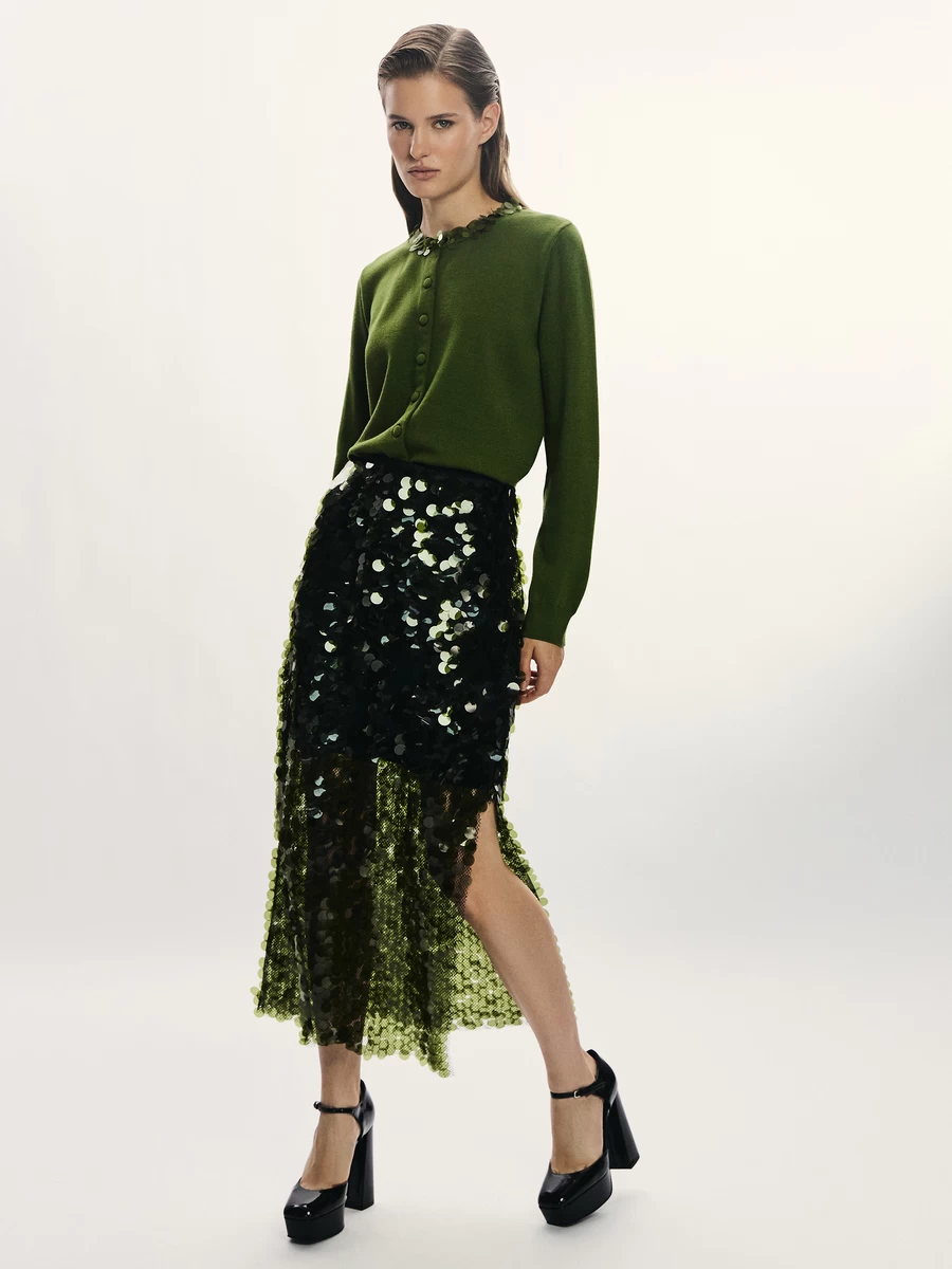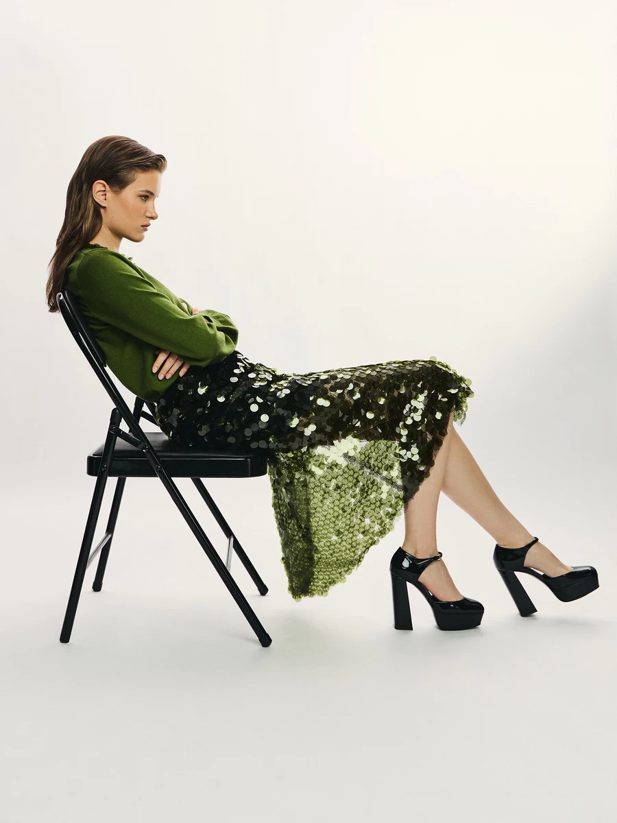 Блестящая юбками с яркими пайетками. Сочетается с лаконичным верхом.