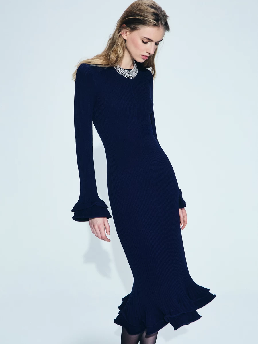 Платье приталенного силуэта. Вырез горловины — круглый. Рукава и подол с воланами.