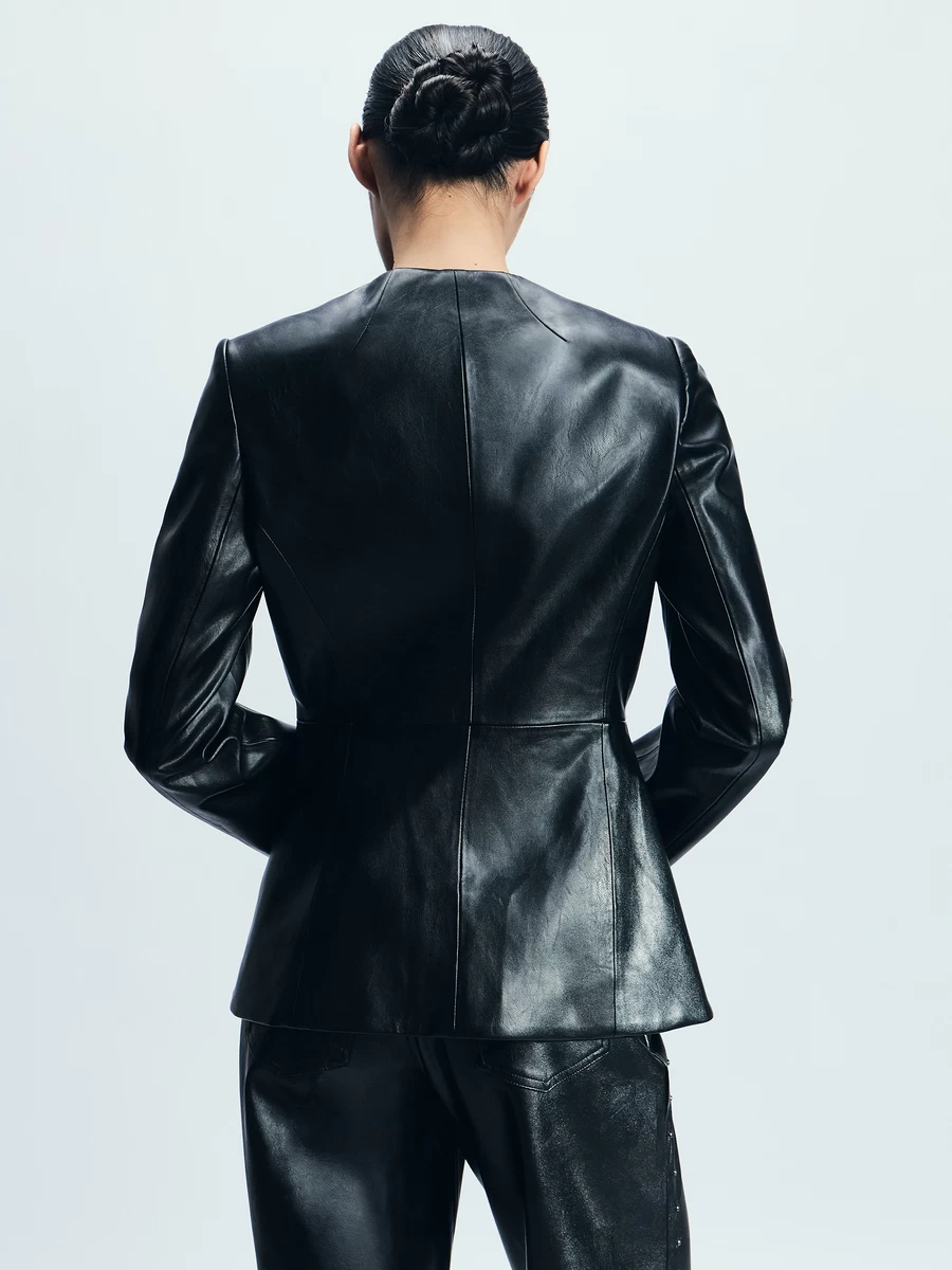 Приталенный жакет из искусственной кожи. Круглый вырез. Застёгивается на пуговицы.