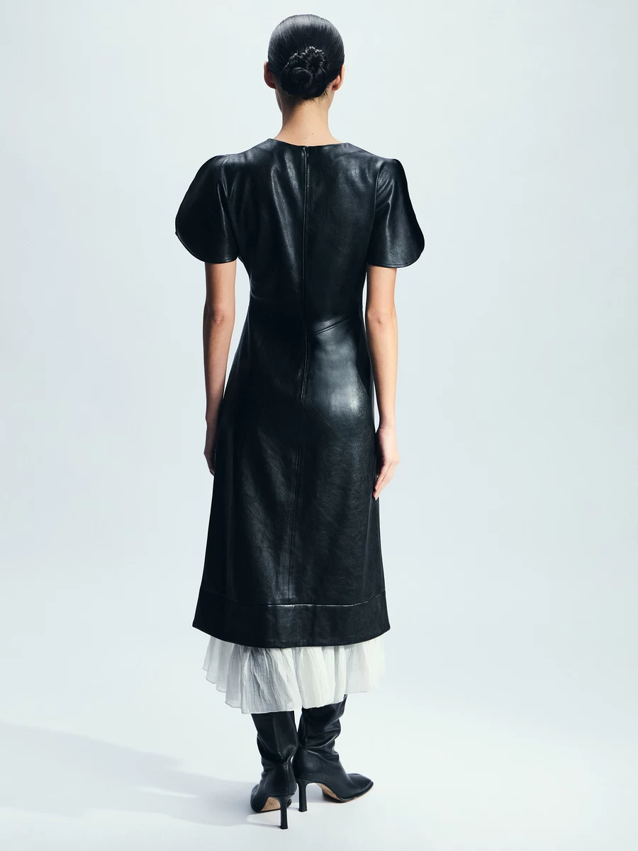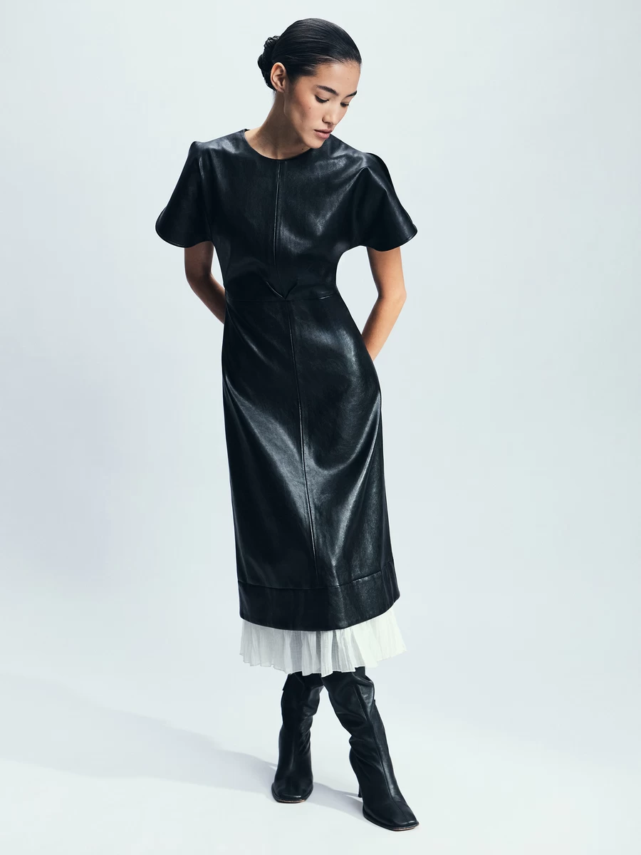 Приталенное платье из искусственной кожи. Внизу — мягкий романтичный белый подол из трендовых рюшей.