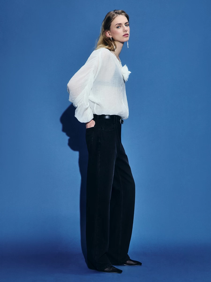 Прямые джинсы с высокой посадкой. Выполнены из тёмно-серого денима. Без эластана.