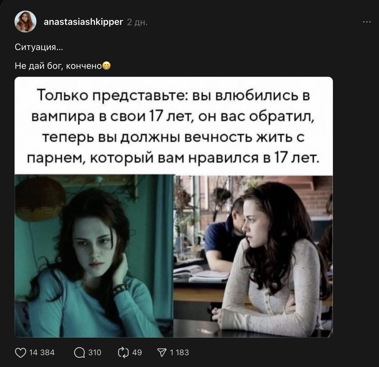 Тред запустила девушка под ником anastasiashkipper. Она запостила мем про Беллу Свон, в котором главная героиня «Сумерек» якобы жалеет о союзе с человеком, в котором влюбилась, когда ей было семнадцать. Anastasiashkipper считает, что это печальная ситуация. Но не все комментаторы с ней согласились.